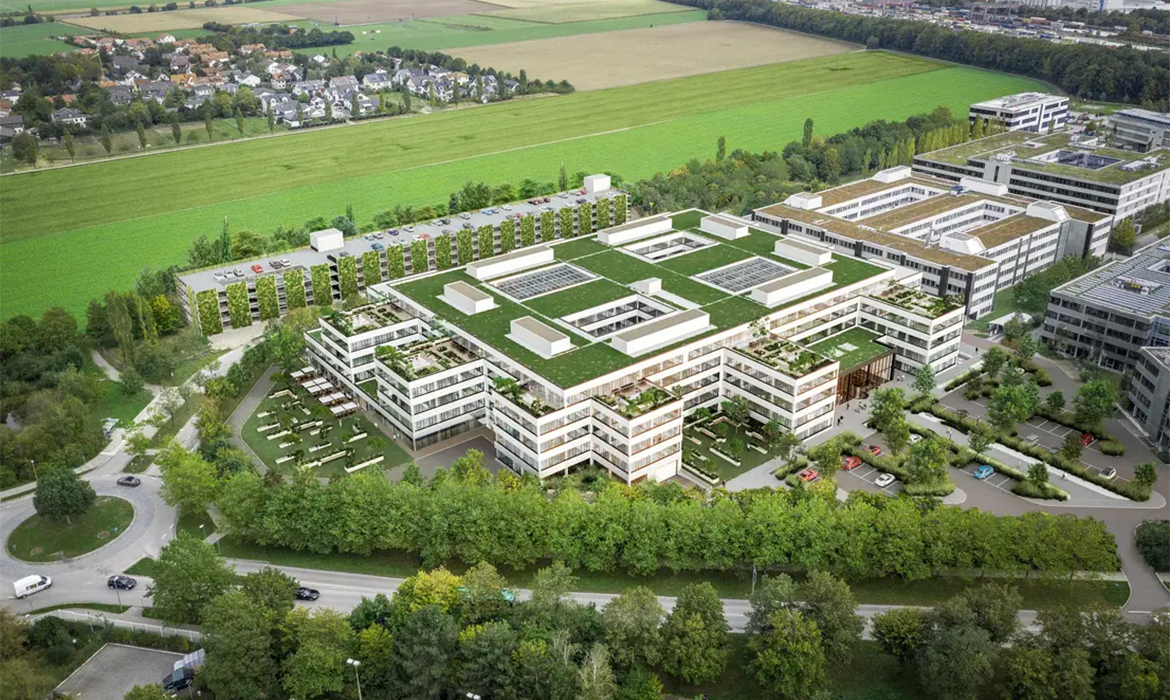8 Geschosse, 2 geschossige TG, Büroräume, Gastronomie, KiTa, LEED Platin Zertifizierung